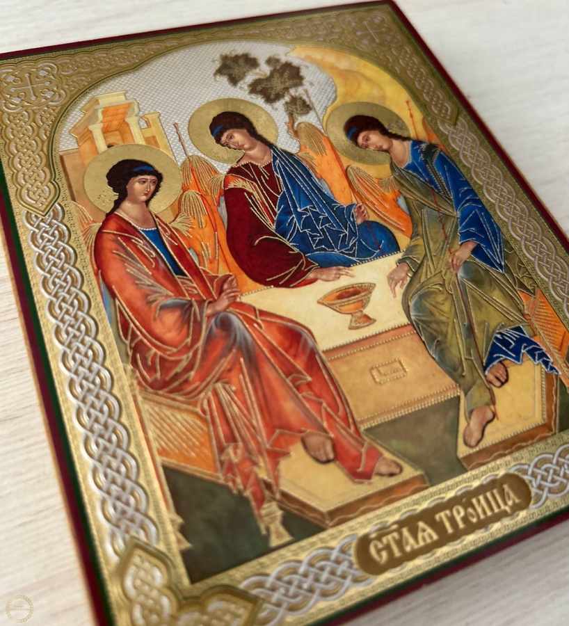 O ícone representa três anjos sentados atrás de um trono, sobre o qual repousa um cálice contendo a cabeça de um bezerro sacrificado. Ao fundo, vêem-se uma casa (os aposentos de Abraão), uma árvore ( o carvalho de Manre ) e uma montanha (o Monte Moriá). As figuras dos anjos estão dispostas de modo que suas linhas formem um círculo fechado. O Ícone da Santíssima Trindade – o significado da imagem. A verdadeira essência do Deus trino é um grande mistério, inacessível à mente humana . A imagem da Santíssima Trindade é uma personificação artística da harmonia divina, da mansidão silenciosa e do amor perdoador do Criador por Suas criações.