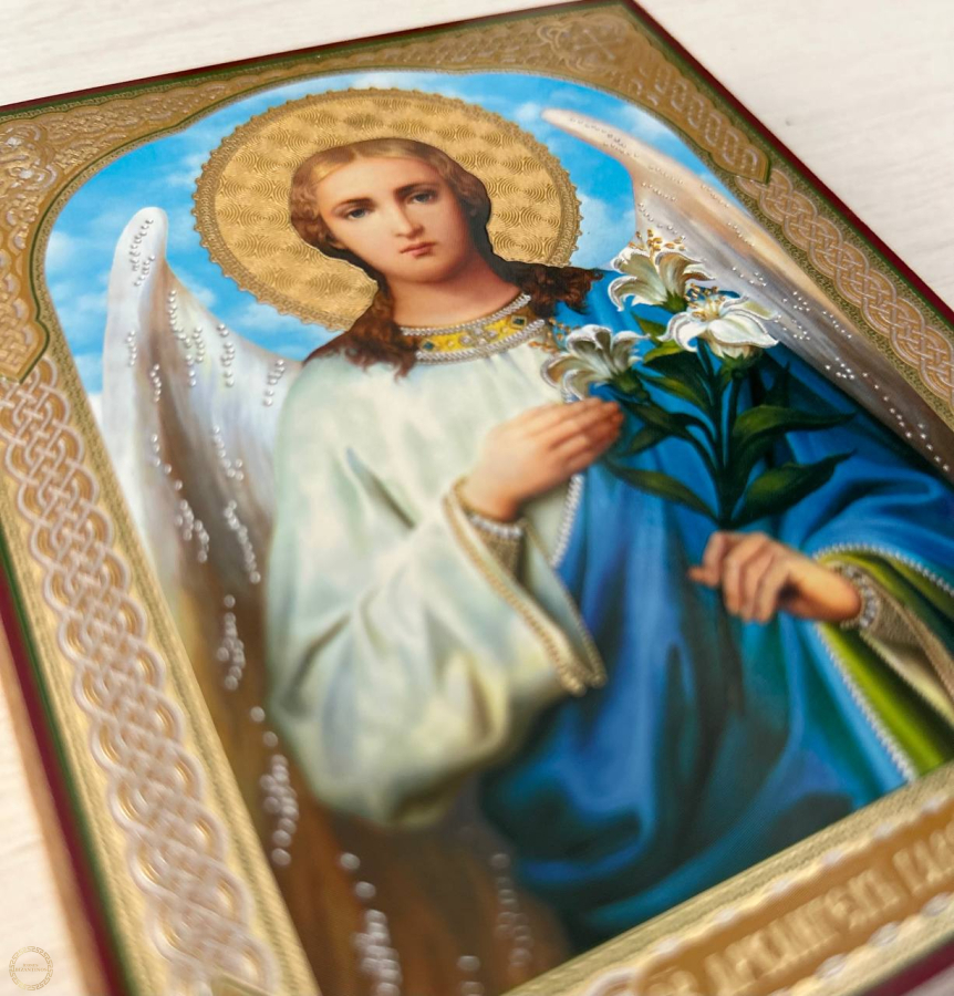Ícone do Arcanjo Gabriel representa um dos principais anjos, o mensageiro dos segredos de Deus, na forma de um jovem com asas e uma auréola, geralmente com um lírio branco ou um ramo de palmeira, simbolizando pureza e boas novas Sua vestimenta pode ser na forma de uma vestimenta de diácono, simbolizando serviço constante ao Senhor, e em suas mãos ele pode segurar um pergaminho, um cajado ou um espelho.