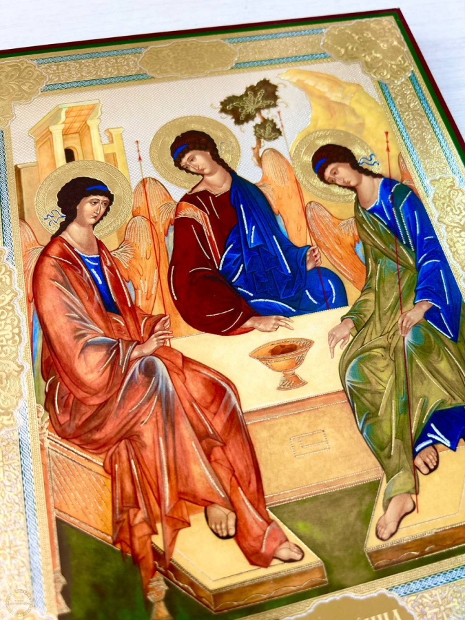 O ícone representa três anjos sentados atrás de um trono, sobre o qual repousa um cálice contendo a cabeça de um bezerro sacrificado. Ao fundo, vêem-se uma casa (os aposentos de Abraão), uma árvore ( o carvalho de Manre ) e uma montanha (o Monte Moriá). As figuras dos anjos estão dispostas de modo que suas linhas formem um círculo fechado. O Ícone da Santíssima Trindade – o significado da imagem. A verdadeira essência do Deus trino é um grande mistério, inacessível à mente humana . A imagem da Santíssima Trindade é uma personificação artística da harmonia divina, da mansidão silenciosa e do amor perdoador do Criador por Suas criações.