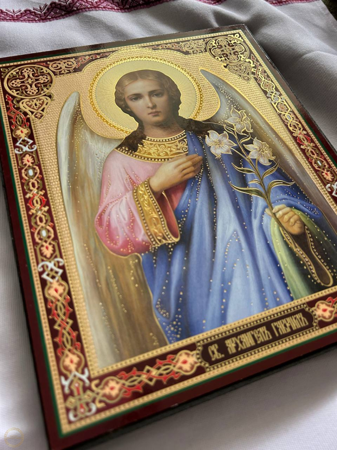 Ícone do Arcanjo Gabriel representa um dos principais anjos, o mensageiro dos segredos de Deus, na forma de um jovem com asas e uma auréola, geralmente com um lírio branco ou um ramo de palmeira, simbolizando pureza e boas novas Sua vestimenta pode ser na forma de uma vestimenta de diácono, simbolizando serviço constante ao Senhor, e em suas mãos ele pode segurar um pergaminho, um cajado ou um espelho.