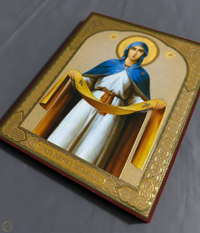 Icone Bizantino Nossa Senhora de Protesao. Pocrova 10x12 cm. 6 mm. O Ícone da Intercessão do Santíssimo Theotokos é uma imagem dedicada à festa do mesmo nome, que é amplamente celebrada anualmente no dia 14 de outubro (1º de outubro, estilo antigo). O papel central nele é desempenhado pelo próprio manto da Mãe de Deus com que ela cobre cada um de nós, protegendo-nos das angústias, dos infortúnios e da perda da fе. Há mais um significado importante do feriado Pokrovsky, que é especialmente relevante hoje. Somos todos filhos de Cristo, ofuscados e unidos pelo seu amor. Isto significa que não deve haver discórdia entre nós, muito menos conflitos sangrentos. Material. Feito na folha de ouro e aplicada no madeira (MDF 6 mm). Atras do icone aplicado um pedaso de fita dupla-face para colar na parede, tambem um suporte para estalar icone. Trabalhamos com lojistas, atacado.