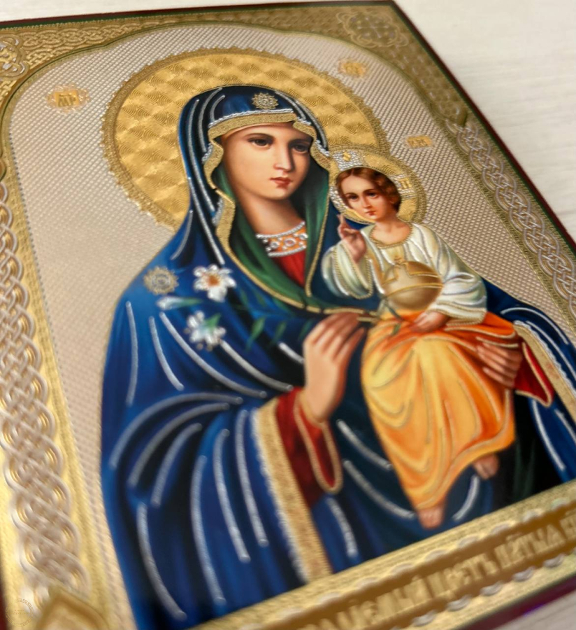 A oração diante do ícone “Unfading Color”, “A Cor Imortal” (“Cor Perfumada” tambem como Nossa Senhora de Saude. ) ajuda as pessoas na “invasão da tristeza”, com a perda de entes queridos, em estado de solidão. Em todos estes casos, a Mãe de Deus ajuda a ganhar força espiritual para superar as provações, continuar a vida e cumprir o dever cristão. Oração à Santíssima Theotokos diante de Seu ícone “A Cor Imortal”: Oh, Santíssima e Imaculada Mãe da Virgem, esperança dos cristãos e refúgio dos pecadores! Proteja todos aqueles que correm para Ti na desgraça, ouça nossos gemidos, incline Seu ouvido à nossa oração. Material. Feito na folha de ouro e aplicada no madeira (MDF 6 mm). Atras do icone aplicado um pedaso de fita dupla-face para colar na parede, tambem um suporte para estalar icone. Trabalhamos com lojistas, atacado.
