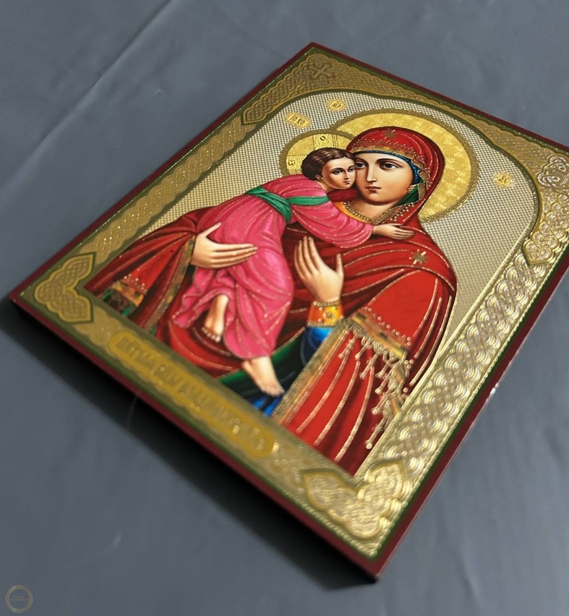 O Ícone Vladimir da Mãe de Deus foi escrito pelo Evangelista Lucas em um quadro da mesa em que o Salvador jantou com a Puríssima Mãe e Justo José. A oração à Mãe de Deus diante do Ícone de Vladimir fortalece o espírito e a fé, ajuda a escolher o caminho certo e cura doenças físicas e mentais. Os crentes oram intensamente a ela para fortalecer os laços familiares e o bem-estar da família. A imagem da Mãe de Deus Vladimir enfatiza a beleza feminina, a sinceridade e a maternidade. Material. Feito na folha de ouro e aplicada no madeira (MDF 6 mm). Atras do icone aplicado um pedaso de fita dupla-face para colar na parede, tambem um suporte para estalar icone. Trabalhamos com lojistas, atacado.