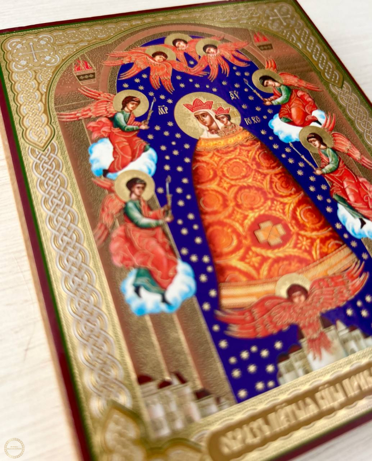 A Santíssima Virgem aumento da inteligência e o Deus Menino são representados com coroas reais na cabeça, enquanto Cristo abençoa com a mão direita e na mão esquerda está um orbe, símbolo do poder real. A Mãe de Deus e o Menino são retratados sobre um fundo verde-oliva escuro sob os raios da luz divina. A peculiaridade do ícone são suas vestes únicas. A Mãe de Deus está vestida junto com o Deus Menino com um longo manto em forma de sino - dalmático. É de cor vermelha, ricamente bordado com cruzes douradas e decorado com pedras preciosas. Nos cantos superiores do ícone existem lâmpadas com chamas. A Santíssima Virgem é representada contra o fundo do céu estrelado, abrindo-se sob o arco do portal. Em ambos os lados, Anjos com velas acesas voam até a Mãe de Deus e o Menino; acima de suas cabeças estão três Serafins, ao pé está um Querubim com asas estendidas. Abaixo você pode ver a cidade, um símbolo da Jerusalém acima. Reverenciado ícone milagroso “Aumento na Mente”. As pessoas recorrem a ela em busca de ajuda para estudar, livrar-se de doenças mentais e esclarecer pensamentos. Material. Feito na folha de ouro e aplicada no madeira (MDF 6 mm). Atras do icone aplicado um pedaso de fita dupla-face para colar na parede, tambem um suporte para estalar icone. Trabalhamos com lojistas, atacado.