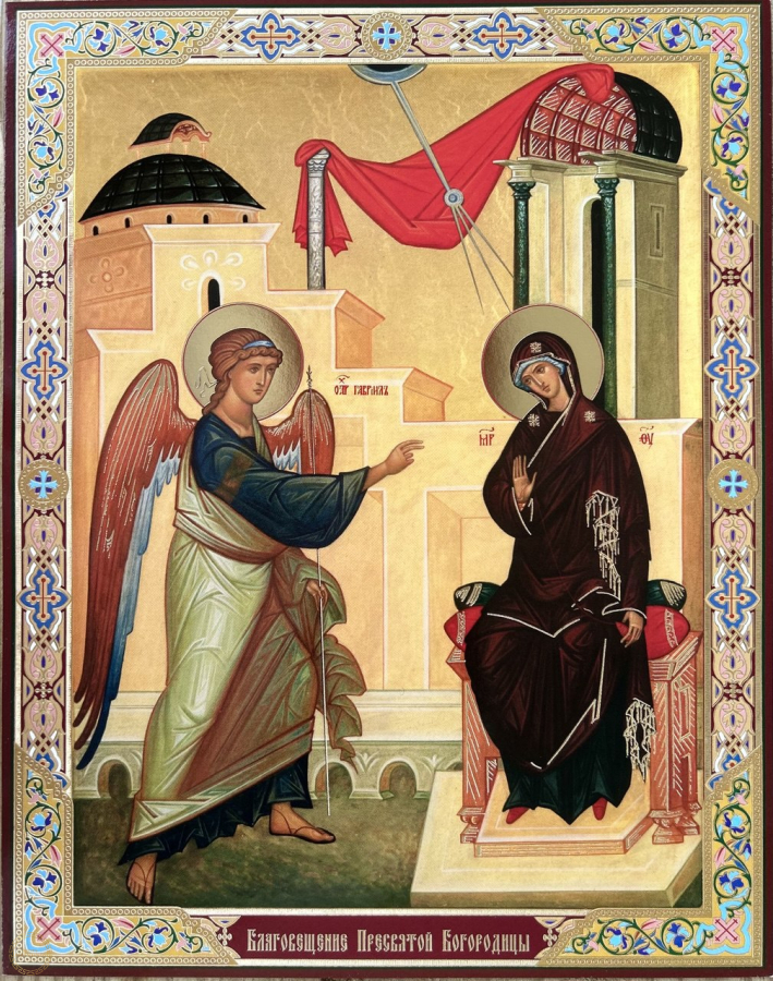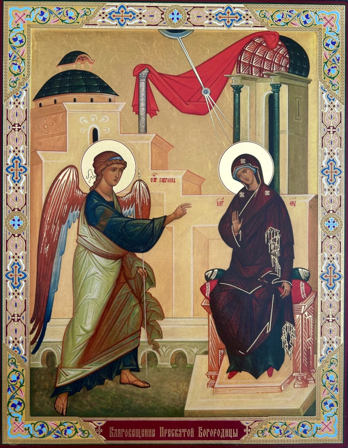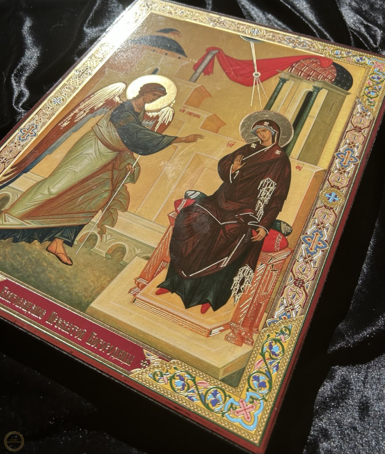 Anunciação da Bem-Aventurada Virgem Maria retrata um evento fundamental do Evangelho: o anúncio do Arcanjo Gabrielà Virgem Maria de que ela se tornaria a Mãedo Salvador do mundo, Jesus Cristo. Este evento simboliza o início da salvação da humanidade e o cumprimento do plano de Deus. Os principais elementos e simbolismo do ícone: Arcanjo Gabriel : Representado com asas, enfatizando suas origens celestiais e seu papel como mensageiro de Deus. Ele pode ser retratado fazendo um gesto de bênção ou segurando um pergaminho, proclamando as Boas Novas. Flor branca (lírio) : Frequentemente presente no ícone (seja nas mãos de Gabriel ou em um vaso) como símbolo da pureza, inocência e virgindade da Santíssima Mãe de Deus. Simbolismo das cores : As vestes da Virgem Maria : O maphorion (vestimenta superior) vermelho-escuro (ou cereja) e o quíton (vestimenta inferior) azul simbolizam a combinação da natureza humana (cor terrena) com a graça divina (cor celestial). Vestes dos Arcanjos : Geralmente claras, douradas ou brancas, simbolizando a luz celestial e a pureza. Gestos : A mão direita erguida de Maria : um gesto de aceitação da mensagem, de concordância com o plano de Deus. O gesto de Gabriel apontando : Aponta para o Céu ou para a própria Maria, enfatizando a origem da mensagem e seu destinatário. Raio de Luz com Pomba : Muitos ícones representam um raio de luz emanando de um segmento do céu no topo, com uma pomba dentro ou voando para baixo. Isso simboliza a descida do Espírito Santo sobre a Virgem Maria e o milagre da Imaculada Conceição.
