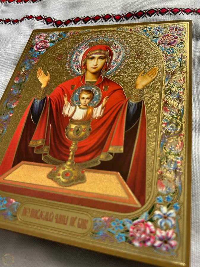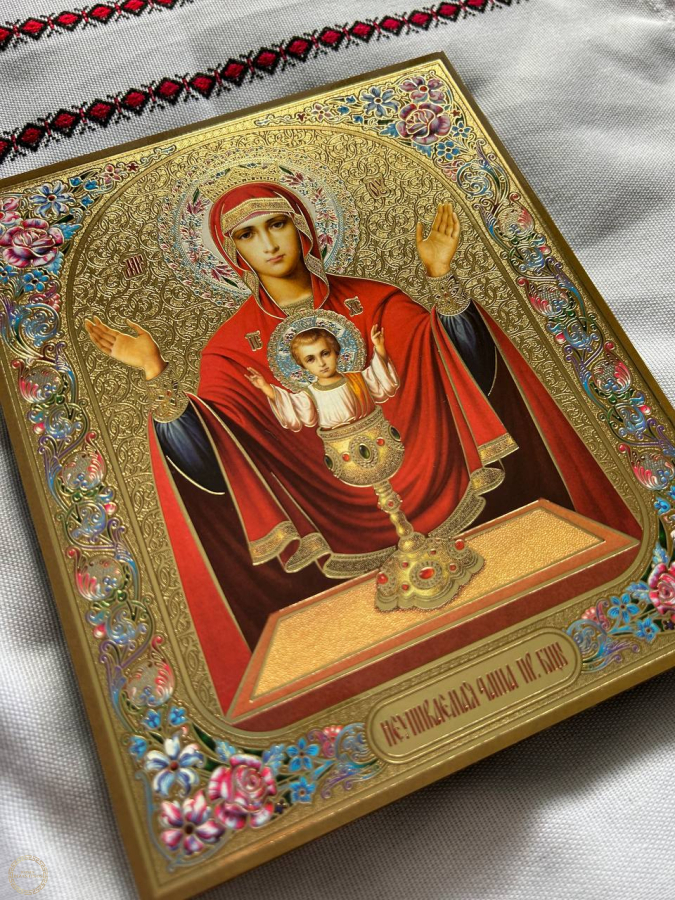 Ícone da Mãe de Deus "Cálice Inesgotavel" considerada milagrosa e auxilia na recuperação do alcoolismo, da dependência de drogas, do tabagismo e de outros vícios.O ícone retrata a Mãe de Deus em pose de oração (Oranta), com o Menino Jesus em pé dentro de um cálice. Surgiu em 1878 e continua sendo muito venerado. História e significado do ícone Origem: O ícone foi descoberto em Serpukhov em 1878 graças a uma visão de um monge ancião a um camponês que bebia. A imagem original se perdeu em 1929, mas cópias veneradas dela são guardadas nos mosteiros de Serpukhov. Iconografia: Este ícone é do tipo "Oranta", onde a Mãe de Deus é representada com as mãos erguidas, em oração pelo mundo. O Menino Jesus está em um cálice, simbolizando a comunhão. Significado: O nome "Cálice Inesgotável" simboliza uma fonte inesgotável de vida e bênçãos espirituais. O ícone auxilia não apenas em vícios físicos, mas também em maus hábitos como compulsão alimentar ou raiva. Ajuda e orações Para vícios: O ícone é considerado um poderoso auxiliar na luta contra o alcoolismo, a dependência de drogas e outras paixões nocivas. Auxílio espiritual: As orações diante do ícone também ajudam a lidar com doenças mentais e a encontrar conforto e graça espiritual. Celebração: Na Igreja Ortodoxa Russa, o ícone é celebrado em 5 de maio.