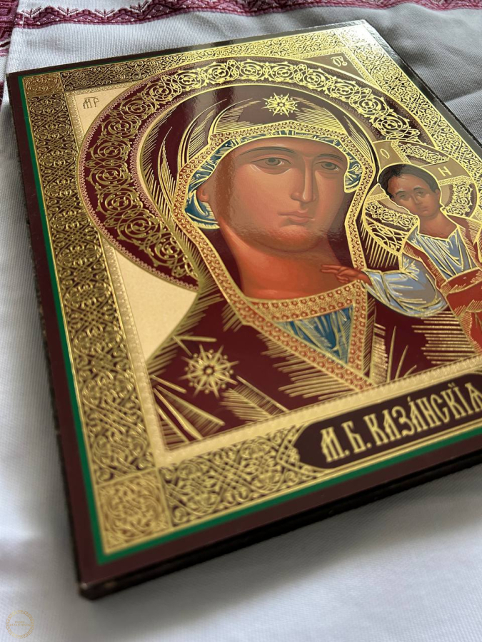 Ícone de Kazan da Mãe de Deus -Um dos ícones mais venerados da Igreja Ortodoxa Russa, que surgiu em Kazan em 1579.Ela é venerada como padroeira da família, protetora em momentos difíceis da vida e auxilia no combate a doenças, especialmente as oculares. As pessoas oram diante do ícone pedindo cura, iluminação espiritual, bem-estar familiar e proteção da pátria.  Significado e importância Padroeira da Família: Acredita-se que o ícone ajude a criar e fortalecer famílias. Os recém-casados ​​são abençoados com o Ícone de Kazan antes do casamento para garantir uma vida familiar feliz. Auxílio em situações difíceis: Recorrem a ela em momentos de luto, tristeza e quando precisam tomar uma decisão importante. Proteção contra doenças: Este ícone é considerado milagroso, curando diversas doenças, incluindo problemas de visão. Defesa da Pátria: Historicamente, era o estandarte do povo russo em tempos difíceis, e as pessoas rezavam diante dele pela proteção do país contra os inimigos. Proteção Infantil: Sua imagem é frequentemente colocada perto do berço de uma criança para protegê-la do mal e das doenças.  Como o ícone é representado O ícone original retrata o Menino Jesus na mão da Mãe de Deus, que aponta para Ele com uma das mãos. A cabeça da Virgem Maria está ligeiramente inclinada, simbolizando a intercessão em oração. O gesto da Criança apontando para a Mãe é interpretado como um símbolo da bênção que Ele concede aos fiéis.