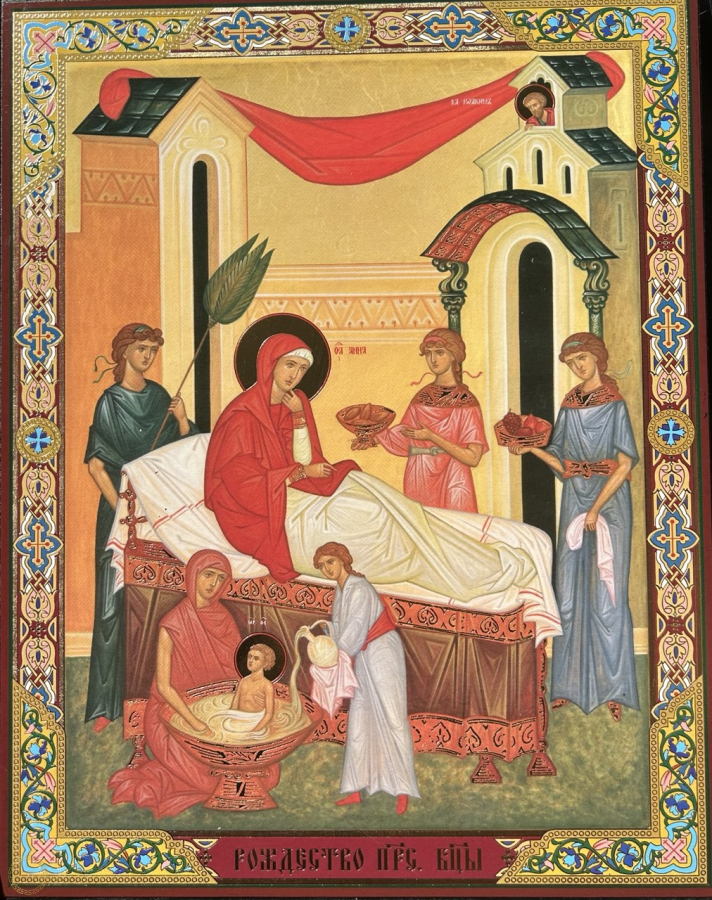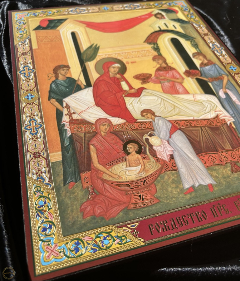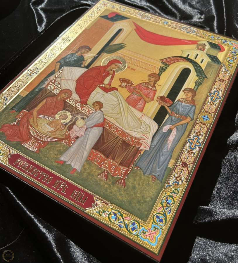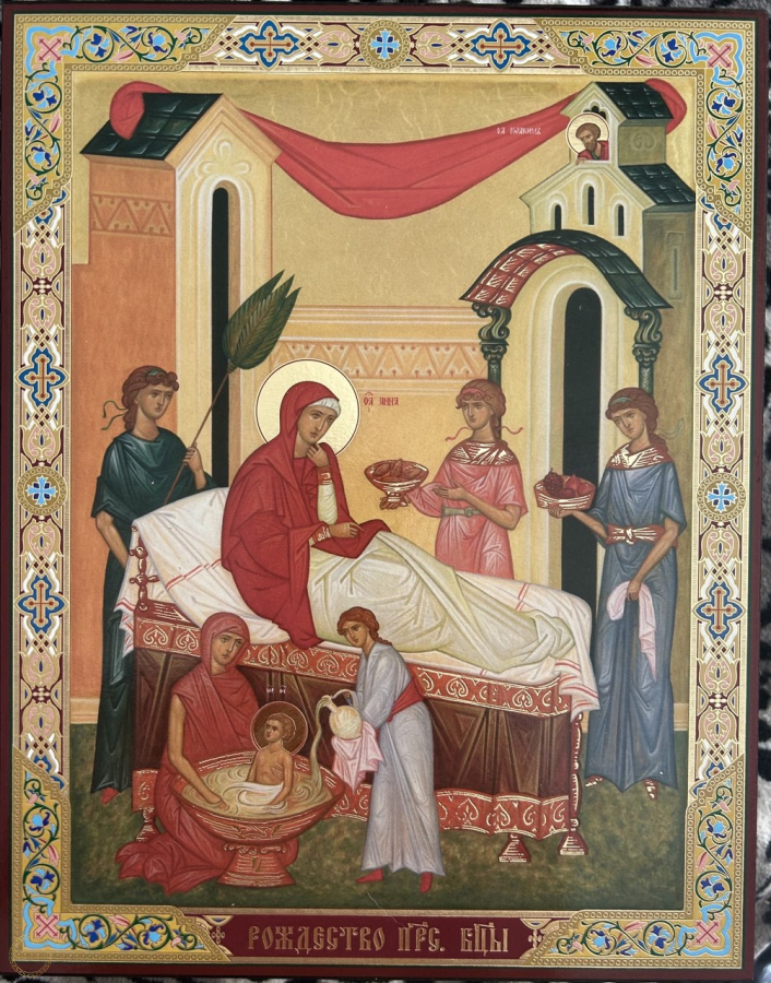 O ícone da Natividade da Nossa Senhora (ou Natividade da Theotokos , Mãe de Deus) é uma representação cheiade significado, embora os Evangelhos canônicos não relacionemo nascimento de Maria. As cenas são antigasem tradições antigas, especialmente o Proto-Evangelho de Tiago,e celebram o início da história da salvação e a vinda daquela que traria Cristo aomundo. simbolismo O ícone simboliza a alegria universal pelo nascimento de Maria, a escolhida por Deus para ser a Mãe do Salvador, e a santidade que começa na vida cotidiana e na obediência a Deus. Os principais elementos e seus significados são: A Recém-Nascida Maria : Maria é mostrada logo após o nascimento, geralmente sendo banhada por parteiras ou servas, em uma cena que lembra a humildade e a normalidade do nascimento humano. Esse detalhe de sua infância, embora humano, prenuncia sua missão divina. São Joaquim : O pai de Maria, São Joaquim, é frequentemente mostrado sentado ou em pé próximo a Sant'Ana, ou às vezes em uma cena separada, demonstrando alegria e gratidão a Deus pela vitória da paternidade após um longo período de infertilidade. Servas e a Vida Doméstica : As figuras secundárias e o ambiente doméstico (comida, água) ilustram a realidade da vida familiar e do cotidiano, mostrando que a santidade e os planos de Deus se manifestam nas situações mais simples da vida. A Importância do Nascimento : Ao contrário da maioria dos santos, cujo dia de celebração é a data da morte (nascimento para o céu), a Igreja celebra o nascimento de Maria (8 de setembro) porque este evento teve um impacto fundamental na história da salvação , preparando o caminho para a vinda de Cristo.