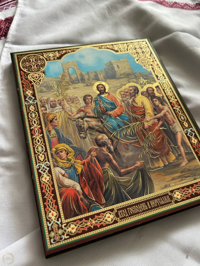 O ícone da Entrada de Jesus em Jerusalém é uma representação vibrante e complexa, cheia desimbolismo teológico, que marca o início da SemanaSanta e a celebração do Domingo de Ramos.Ele captura o momento em que Jesus éaclamado como Messias e Rei, mas também prefiguraSua Paixão e Ressurreição. O ícone da Entrada em Jerusalém é uma imagem de triunfo paradoxal. Jesus entra como um rei, mas um rei humilde, que manifestará a vinda do Reino de Deus não pelo poder militar, mas pela Paixão, Morte e, finalmente, pela Ressurreição. por que é bom ter este ícone em casa? Ter o ícone da Entrada de Jesus em Jerusalém (Domingo de Ramos) em casa é considerada boa por várias razões que tocam a espiritualidade e a vida familiar, organizada como um poderoso lembrete visual dos mistérios da fé cristã. Aqui os principais motivos: 1. Um Lembrete da Realeza Humilde de Cristo O ícone é um lembrete constante de que Jesus é o Rei, mas Seu reino não é baseado no poder mundano, e sim na humildade e no serviço. A imagem de Jesus montada em um simples jumento, em contraste com a expectativa de um cavalo de guerra, inspira os moradores da casa a praticarem a humildade e a considerarem a verdadeira natureza da liderança cristã, que é a de servir e não dominar. 2. Símbolo de Esperança e Vitória Os ramos de palmeira no ícone simbolizam a vitória (sobre o pecado e a morte) e a vida eterna. Ter esta imagem em casa traz uma mensagem de esperança: por meio de Cristo, é possível triunfar sobre as dificuldades e desafios da vida. É um lembrete visual de que, após a paixão, vem a ressurreição e a glória. 3. Conexão com a Semana Santa e a Liturgia Para as famílias cristãs, o ícone ajuda a viver o ano litúrgico de forma mais profunda. Ele marca a "porta de entrada" para a Semana Santa. Ter o ícone em casa ajuda a preparar o coração para a celebração da Paixão, Morte e Ressurreição de Jesus, tornando o lar um espaço onde a fé é vívida e não apenas comemorada na igreja. 4. Ensino para Crianças e Família O ícone é uma ferramenta catequética poderosa. As crianças são figuras proeminentes no ícone, aclamando Jesus com alegria. Isso ensina que a fé deve ser vívida com simplicidade e entusiasmo. Uma imagem facilita uma conversa sobre a história de Jesus, Seu amor pela humanidade e os eventos que levaram à Sua crucificação e ressurreição. 5. Um Chamado à Aclamação Diária A multidão no ícone aclama Jesus como "Hosana!" ("Salva-nos, nós te pedimos!"). Ter este ícone em casa encoraja os moradores a fazerem dessa aclamação uma atitude diária de adoração e confiança em Deus, reconhecendo a soberania de Cristo em todos os aspectos da vida familiar.
