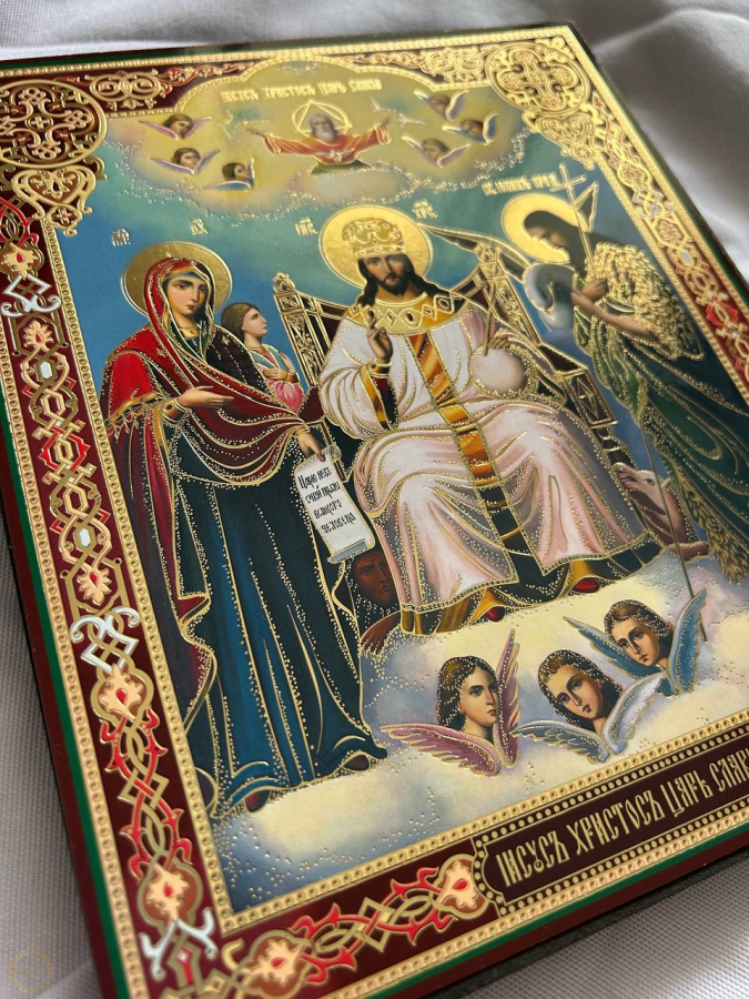 Icone O Rei dos Reis - Jesus Cristo no trono (Rei da Glória) 20x24 cm 15 mm A imagem de Cristo no túmulo, também conhecida como ícone do Rei da Glória, é uma das mais veneradas entre os cristãos. Tradicionalmente, esse ícone é colocado no centro do iconostásio, acima de todas as outras imagens. Ele simboliza o sofrimento terreno de Cristo por toda a humanidade e sua ascensão O Rei da Glória é Jesus Cristo: E o Rei da Glória virá (Salmo 24:7). Cristo é chamado de "Rei da Glória" e "Senhor da Glória" como o mais glorioso, o doador da glória e aquele que reina e governa sobre todos os gloriosos.