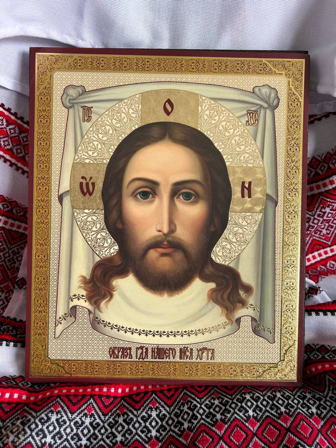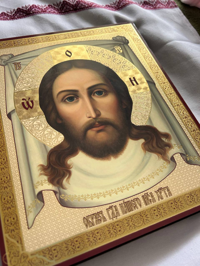 Ícone A Imagem de Cristo Não Feita por Mãos Humanas (também conhecida comoImagem de Cristo Não Feita por Mãos HumanasouMandylion) -Sua singularidade reside na lenda de sua origem milagrosa: acredita-se que essa imagem não foi criada pela mão de um pintor de ícones, mas sim impressa em um tecido (um pano) durante a vida de Jesus Cristo. O ícone do Rosto de Cristo Não Feito por Mãos Humanas (em russo: The Image of Christ Not Made by Hands ou Spas Nerukotvorny ) é uma das representações mais antigas, veneradas e teologicamente importantes da fé ortodoxa. O nome "não feito por mãos humanas" (do grego acheiropoietos ) indica que, segundo a tradição, a imagem não foi pintada por um artista, mas sim um milagre, um autorretrato divino.