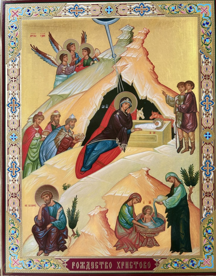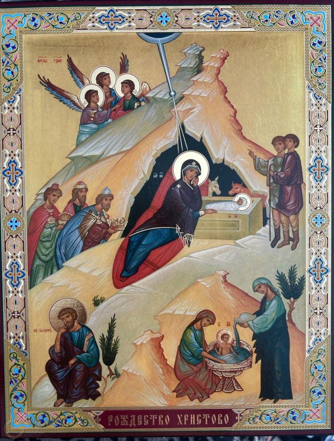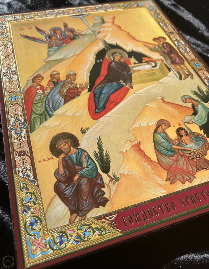 Natividade de Cristo. Icone 23x30 cm 15 mm Ter o ícone da Natividade de Cristo (Nascimento de Jesus) em casa é altamente valorizado na tradição cristã, não apenas como decoração sazonal, mas como um elemento espiritual permanente que enriquece a vida de fé da família. O ícone é o lembrete visual mais poderoso do mistério central da fé cristã: a Encarnação - o momento em que Deus se fez homem por amor à humanidade. Ele mostra a humildade radical de Deus, que escolheu nascer numa caverna escura e fria, não em um palácio. Esta imagem inspira gratidão, humildade e a compreensão de que Deus está próximo de nós, mesmo nas realidades mais simples e difíceis da vida. A caverna escura no ícone simboliza o mundo antes da graça redentora, ou as "trevas" do pecado e do sofrimento em nossas vidas. A luz que emana do Menino Jesus e da estrela representa a esperança e a salvação que Ele trouxe ao mundo. Ter este ícone em casa é um lembrete diário de que, mesmo nos momentos mais sombrios, a luz de Cristo brilha e a esperança da redenção está sempre presente. O ícone destaca a Sagrada Família (Maria, José e o Menino). A figura de Maria, serena e contemplativa, é um modelo de maternidade e acessível à vontade de Deus. O ícone santifica a vida familiar, lembrando que o lar é o primeiro lugar onde Deus se manifesta e onde a fé é vivida e transmitida. Ele valoriza a dignidade da vida humana desde o início. Ter o ícone em casa ajuda a família a se manter sintonizada com o calendário litúrgico da Igreja, especialmente durante a época do Natal e da Epifania, aprofundando a celebração do mistério do nascimento de Cristo durante todo o ano.