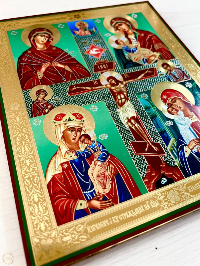 Icone Bizantino Nossa Senhora com Crucifixo 17x21 cm. 6 mm Este ícone servirá como um presente maravilhoso e valioso para um crente em qualquer feriado ou se tornará um santuário na iconostase de sua casa. Uma bela imagem de alta qualidade feita sobre base de madeira com dupla estampagem dourada. Ícones quadripartidos são quatro ícones diferentes, cada um com seu próprio tema, pintados em um quadro. Ícone de quatro partes, 4 ícones da Mãe de Deus: Abrandamento dos Corações Maus (Czestochowa), Acalmando minhas Dores, Libertação das Problemas do Sofrimento, Recuperando os Perdidos.